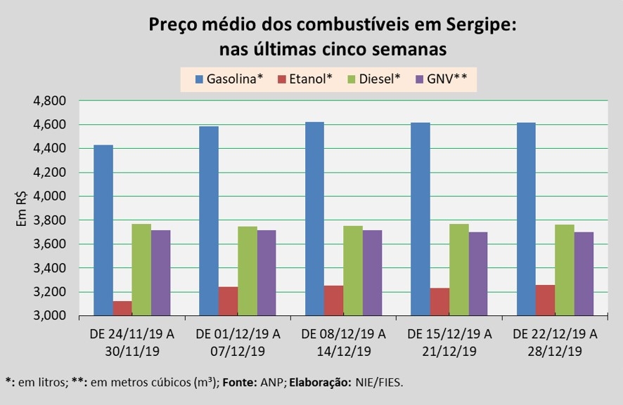 Análise realizada pelo Boletim Sergipe Econômico, parceria do Núcleo de Informações Econômicas (NIE) da Federação das Indústrias do Estado de Sergipe (FIES) e do Departamento de Economia da UFS, com base nos dados da Agência Nacional do Petróleo, Gás Natural e Biocombustíveis (ANP), revelou que na semana de 22 a 28 de dezembro, o preço médio do diesel vendido em Sergipe foi de R$ 3,764, assinalando redução de 0,2% em relação à semana anterior (15 a 21 de dezembro). O preço médio da gasolina, por sua vez, foi de R$ 4,617, assinalando queda de 0,02% na mesma comparação.
