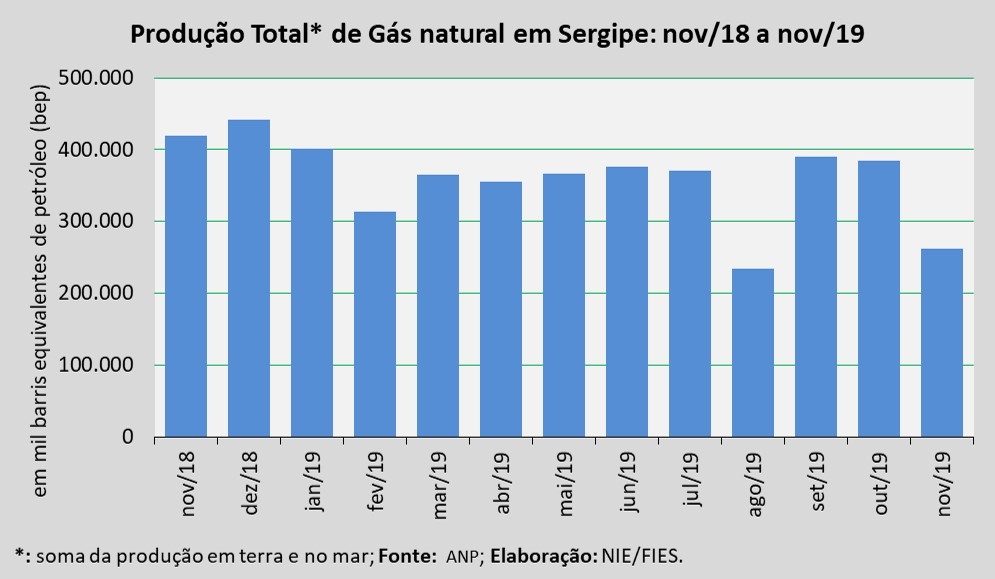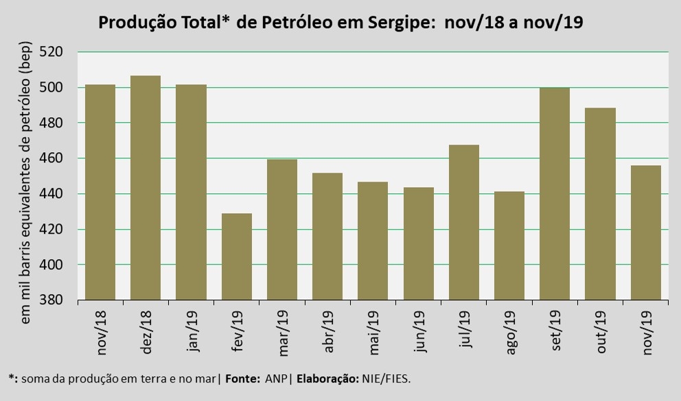 Análise realizada pelo Boletim Sergipe Econômico, parceria do Núcleo de Informações Econômicas (NIE) da Federação das Indústrias do Estado de Sergipe (FIES) e do Departamento de Economia da UFS, com base nos dados da Agência Nacional do Petróleo, Gás Natural e Biocombustíveis (ANP), mostrou que a produção de petróleo no estado, em novembro de 2019, foi de 456,1 mil barris equivalentes de petróleo (BEP), registrando redução de 6,6% em relação à produção do mês anterior, outubro do ano que findou. No comparativo com novembro de 2018, a retração apresentada na produção foi de 9,1%.