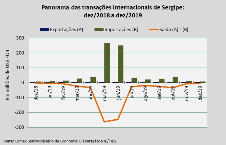 O saldo da balança comercial em Sergipe, no acumulado do ano de 2019, registrou déficit de US$ 690,7 milhões. O resultado deveu-se ao volume atípico de importações, realizadas em maio e junho. Os principais produtos importados durante o ano que findou foram: outros grupos eletrogêneos (US$ 161,6 milhões); condensadores para máquinas a vapor (US$ 102,6 milhões); caldeiras aquatubulares com produção de vapor (US$ 64,5 milhões); outros grupos eletrogêneos (US$ 62,7 milhões); e, outros aparelhos e dispositivos para tratamento de matérias por meio de operações que impliquem mudança de temperatura (US$ 52,8 milhões).