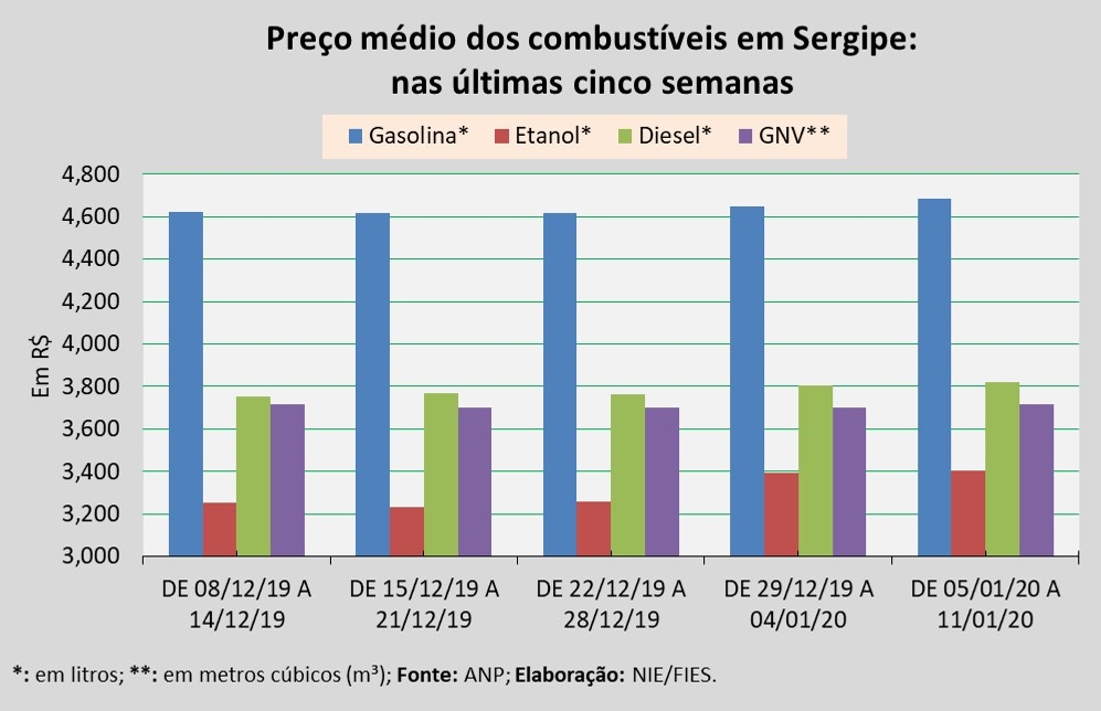 Análise realizada pelo Boletim Sergipe Econômico, parceria do Núcleo de Informações Econômicas (NIE) da Federação das Indústrias do Estado de Sergipe (FIES) e do Departamento de Economia da UFS, com base nos dados da Agência Nacional do Petróleo, Gás Natural e Biocombustíveis (ANP), revelou que na semana de 05 a 04 de janeiro de 2020, o preço médio do etanol vendido em Sergipe foi de R$ 3,404, assinalando aumento de 0,3% em relação à semana anterior (29 de dezembro de 2019 a 04 de janeiro de 2020).