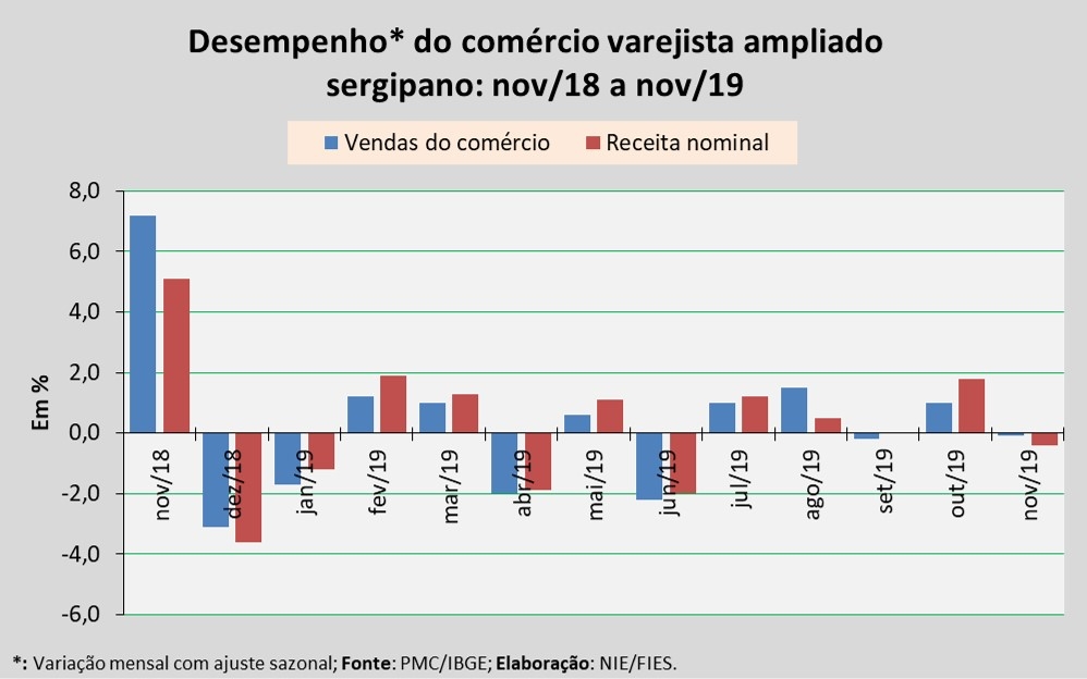 Análise realizada pelo Boletim Sergipe Econômico, parceria do Núcleo de Informações Econômicas (NIE) da Federação das Indústrias do Estado de Sergipe (FIES) e do Departamento de Economia da UFS, com base nos dados da Pesquisa Mensal do Comércio (PMC) do IBGE, apontou que as vendas do comércio varejista ampliado sergipano, em novembro de 2019, assinalaram leve redução de 0,1% em relação ao mês imediatamente anterior (outubro/19), na série com ajuste sazonal (método que uniformiza os períodos de comparação). No comparativo com novembro de 2018, por sua vez, o recuo observado nas vendas foi de 2,8%.