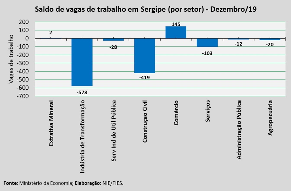 Análise realizada pelo Boletim Sergipe Econômico, parceria do Núcleo de Informações Econômicas (NIE) da Federação das Indústrias do Estado de Sergipe (FIES) e do Departamento de Economia da UFS, com base nos dados do Cadastro Geral de empregados e desempregados (Caged) da Secretaria de Trabalho do Ministério da Economia, revelou que o Estado de Sergipe obteve saldo positivo de 2.374 vagas de trabalho com carteira assinada, em 2019.