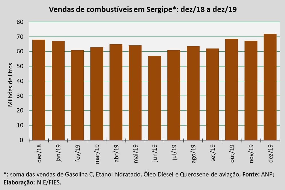 Análise realizada pelo Boletim Sergipe Econômico, parceria do Núcleo de Informações Econômicas (NIE) da Federação das Indústrias do Estado de Sergipe (FIES) e do Departamento de Economia da UFS, com base nos dados da Agência Nacional do Petróleo, Gás Natural e Biocombustíveis (ANP), indicou que as vendas totais de combustíveis em 2019 somaram aproximadamente 770,8 milhões de litros, assinalando aumento de 1,4% quando comparado ao ano anterior.