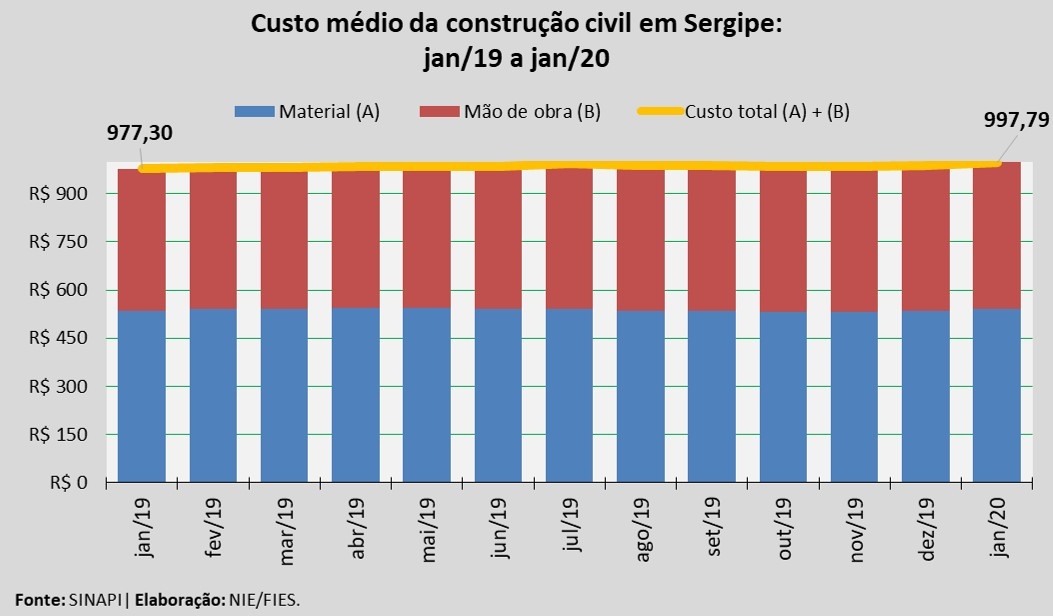 Em termos relativos, o custo com material, no mês considerado, teve aumento de 0,9% na comparação com o mesmo mês (janeiro) do ano que findou. No entanto, quando comparado com dezembro de 2019, o acréscimo foi de 1,1%.