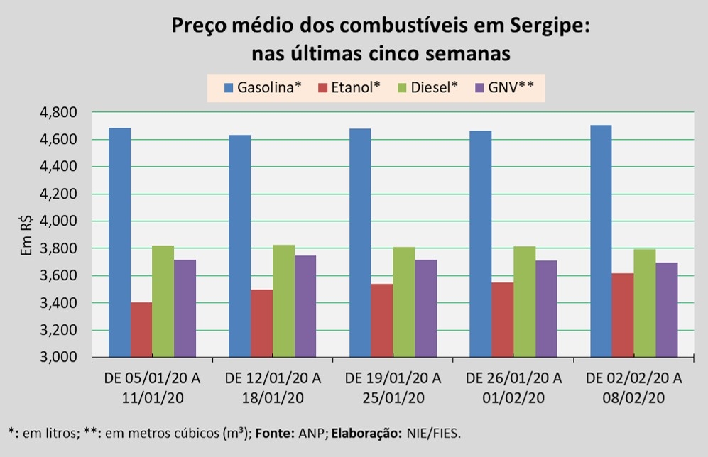 No comparativo com a média registrada no Brasil (R$ 4,578) e no Nordeste (R$ 4,580), o preço médio da gasolina (ao consumidor), na semana analisada (02 a 08 de fevereiro), observado em Sergipe foi superior.