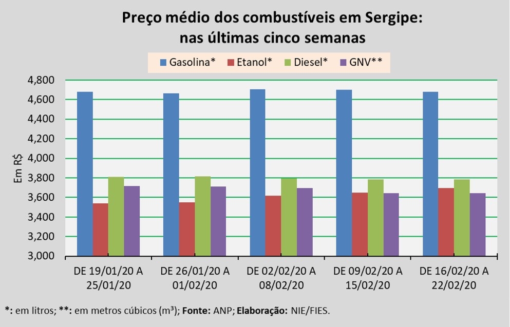 Análise realizada pelo Boletim Sergipe Econômico, parceria do Núcleo de Informações Econômicas da Federação das Indústrias do Estado de Sergipe (FIES) e do Departamento de Economia da UFS, com base nos dados da Agência Nacional do Petróleo, Gás Natural e Biocombustíveis (ANP), revelou que na semana de 16 a 22 de fevereiro de 2020, o preço médio da gasolina, vendido em Sergipe foi de R$ 4,681, assinalando queda de 0,4% em relação à semana anterior (09 a 15 de fevereiro).