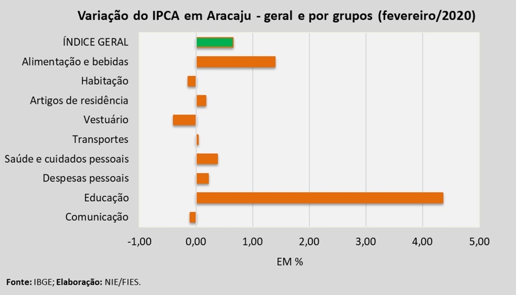 Análise realizada pelo Boletim Sergipe Econômico, parceria do Núcleo de Informações Econômicas da Federação das Indústrias do Estado de Sergipe (FIES) e do Departamento de Economia da UFS, com base nos dados do Instituto Brasileiro de Geografia e Estatística (IBGE), revelou que, em fevereiro deste ano, a capital sergipana teve inflação de 0,66%, medida pelo Índice de Preços ao Consumidor Amplo – IPCA.