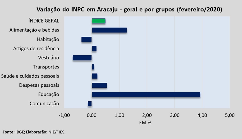 Dentre os nove grupos de produtos e serviços que foram pesquisados para medir o comportamento dos preços, em Aracaju, verificou-se que assinalaram aumento nos preços, no período analisado, os grupos de Educação (+4,36%), Alimentação e bebidas (+1,40%), Saúde e cuidados pessoais (+0,38%), Despesas pessoais (+0,22%) e Artigos de residência (+0,17%). ![]()