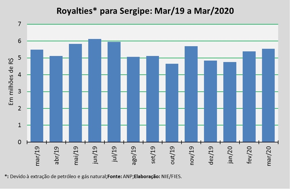 Análise realizada pelo Boletim Sergipe Econômico, parceria do Núcleo de Informações Econômicas da Federação das Indústrias do Estado de Sergipe (FIES) e do Departamento de Economia da UFS, com base nos dados da Agência Nacional do Petróleo, Gás Natural e Biocombustíveis (ANP), revelou que o pagamento de royalties ao Estado de Sergipe, referentes à extração de petróleo e gás natural do mês de janeiro, ficou em R$ 5,5 milhões. O valor, segundo a ANP, foi creditado em março.