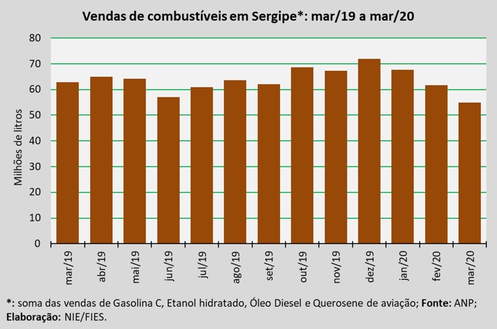 Análise realizada pelo Boletim Sergipe Econômico, parceria do Núcleo de Informações Econômicas da Federação das Indústrias do Estado de Sergipe (FIES) e do Departamento de Economia da UFS, com base nos dados da Agência Nacional do Petróleo, Gás Natural e Biocombustíveis (ANP), indicou que as vendas totais de combustíveis em Sergipe, em março deste ano, totalizaram aproximadamente 54,9 milhões de litros, assinalando queda de 12,5% quando comparado a março de 2019. Em relação ao mês imediatamente anterior, fevereiro último, as vendas diminuíram 11%.