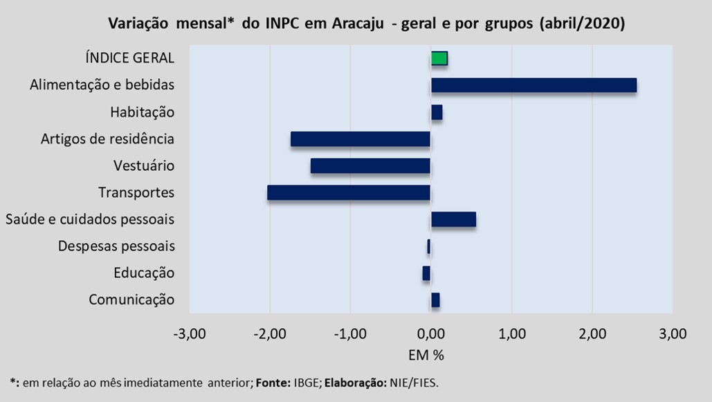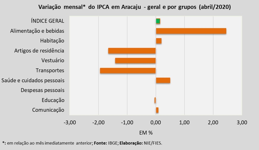 Dentre os nove grupos de produtos e serviços que foram pesquisados para medir o comportamento dos preços, em Aracaju, verificou-se que assinalaram aumento nos preços, no período analisado, os grupos de Alimentação e bebidas (+2,45%), Saúde e cuidados pessoais (+0,49%), Habitação (+0,19%) e Comunicação (+0,08%).