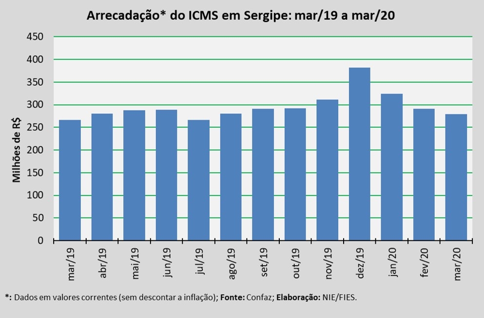 Análise realizada pelo Boletim Sergipe Econômico, parceria do Núcleo de Informações Econômicas da Federação das Indústrias do Estado de Sergipe (FIES) e do Departamento de Economia da UFS, com base nos dados do Conselho Nacional de Política Fazendária (Confaz), apontou que a arrecadação do Imposto sobre Circulação de Mercadorias e Prestação de Serviços (ICMS), em Sergipe, ficou próxima a R$ 279 milhões, em março deste ano.