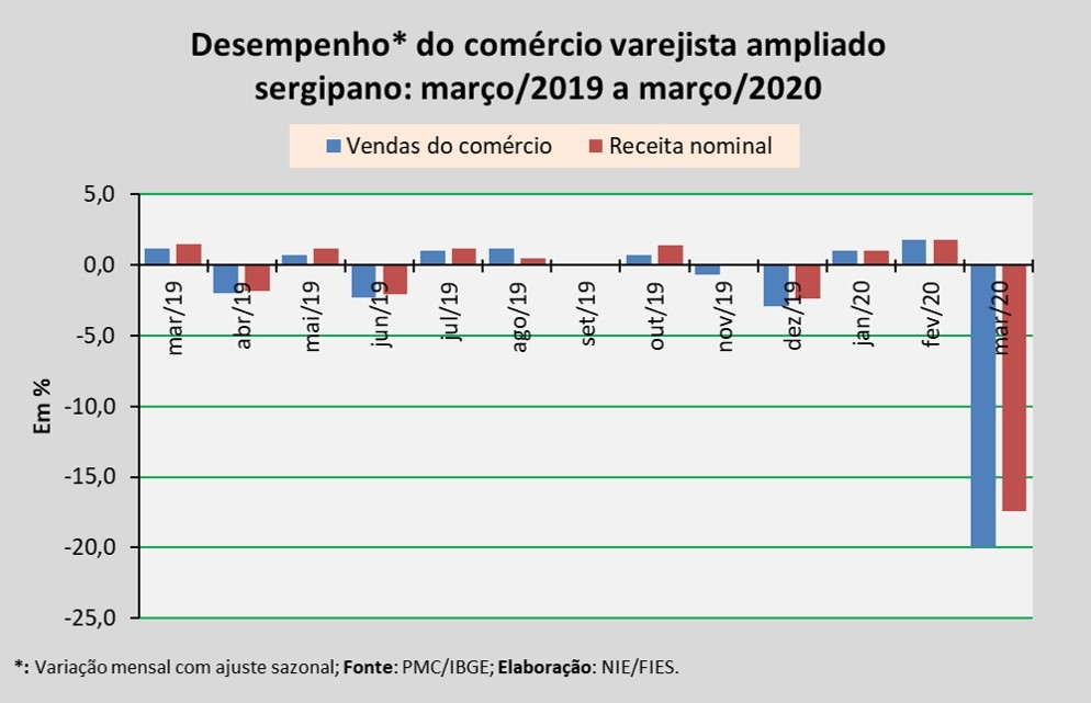 Análise realizada pelo Boletim Sergipe Econômico, parceria do Núcleo de Informações Econômicas da Federação das Indústrias do Estado de Sergipe (FIES) e do Departamento de Economia da UFS, com base nos dados da Pesquisa Mensal do Comércio (PMC) do IBGE, apontou que, em março deste ano, as vendas do comércio varejista ampliado sergipano assinalaram queda de 20% em relação ao mês imediatamente anterior (fevereiro/2020), na série com ajuste sazonal (método que uniformiza os períodos de comparação). Essa variação corresponde à queda mais acentuada da série iniciada em janeiro de 2004. Já em relação a março do ano passado, observou-se recuo de 6,9%.