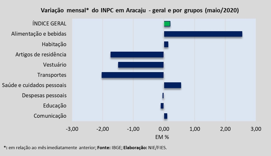 Para esse público, a pesquisa é feita através do Índice Nacional de Preços ao Consumidor (INPC), que registrou queda de 0,35%, em maio de 2020. O intervalo de comparação é o mesmo do IPCA descrito acima.