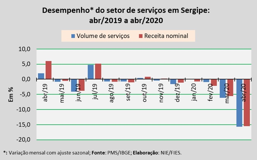 Análise realizada pelo Boletim Sergipe Econômico, parceria do Núcleo de Informações Econômicas da Federação das Indústrias do Estado de Sergipe (FIES) e do Departamento de Economia da UFS, com base nos dados da Pesquisa Mensal de Serviços (PMS) do IBGE, revelou que, em abril deste ano, o setor de serviços em Sergipe registrou queda de 15,7% no volume de serviços prestados, em relação ao último mês de março, na série com ajuste sazonal (método utilizado para uniformizar os períodos de comparação). Na comparação com abril do ano passado, o volume de serviços assinalou retração de 24%.
