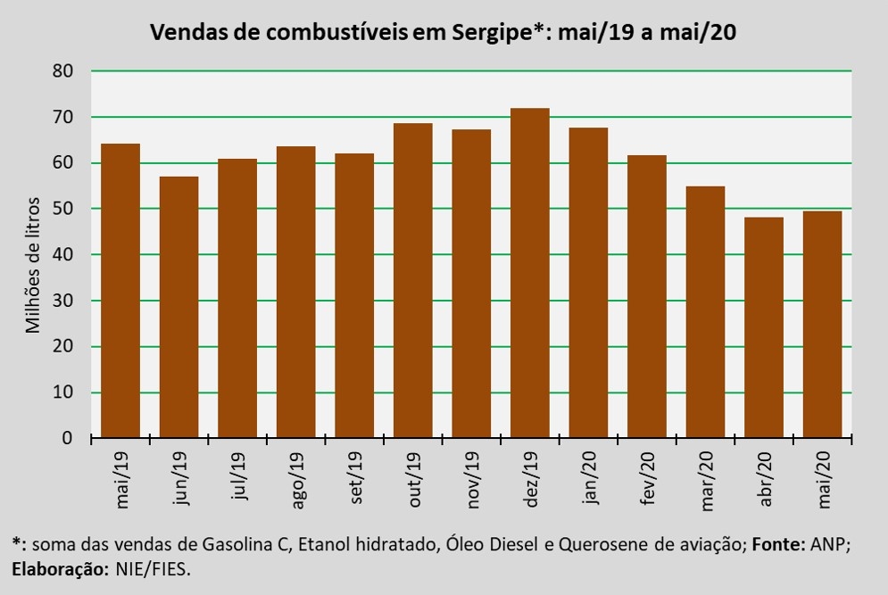 Análise realizada pelo Boletim Sergipe Econômico, parceria do Núcleo de Informações Econômicas da Federação das Indústrias do Estado de Sergipe (FIES) e do Departamento de Economia da UFS, com base nos dados da Agência Nacional do Petróleo, Gás Natural e Biocombustíveis (ANP), indicou que as vendas totais de combustíveis em Sergipe, em maio deste ano, somaram aproximadamente 49,4 milhões de litros, assinalando queda de 23% quando comparado a maio de 2019. Em relação ao mês imediatamente anterior, abril último, as vendas aumentaram 2,5%.