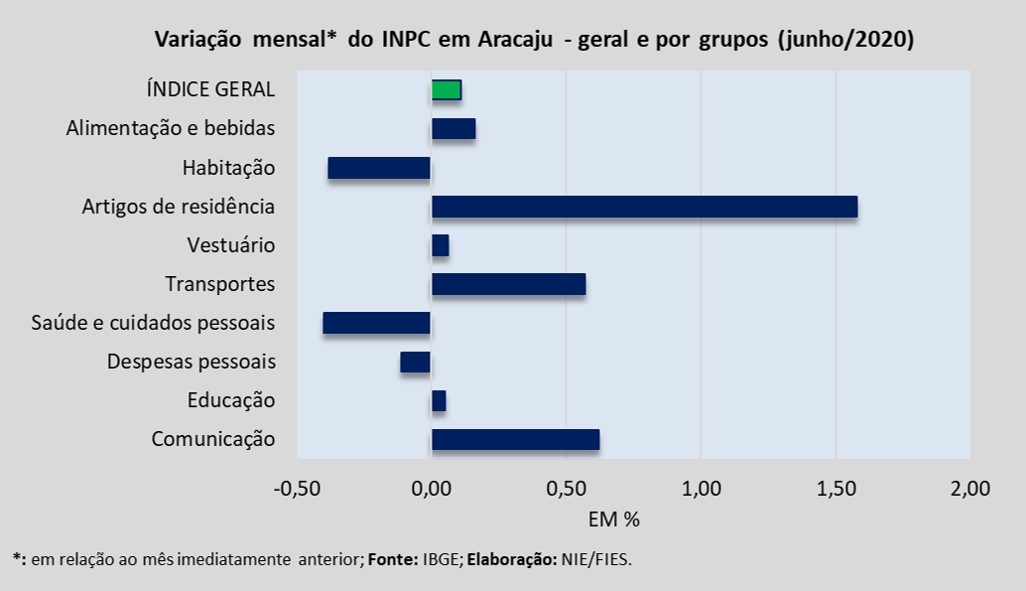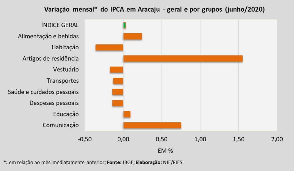 Dentre os nove grupos de produtos e serviços que foram pesquisados para medir o comportamento dos preços, em Aracaju, verificou-se que os grupos de Artigos de residência (+1,55%), Comunicação (+0,75%), Alimentação e bebidas (+0,24%) e Educação (+0,09%) assinalaram aumento nos preços, no período analisado.