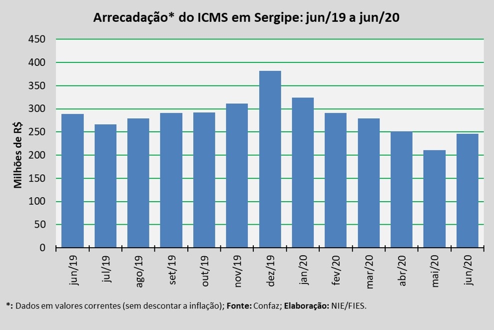 Análise realizada pelo Boletim Sergipe Econômico, parceria do Núcleo de Informações Econômicas da Federação das Indústrias do Estado de Sergipe (FIES) e do Departamento de Economia da UFS, com base nos dados do Conselho Nacional de Política Fazendária (Confaz), apontou que a arrecadação do Imposto sobre Circulação de Mercadorias e Prestação de Serviços (ICMS), em Sergipe, chegou a R$ 246,6 milhões, em junho deste ano.