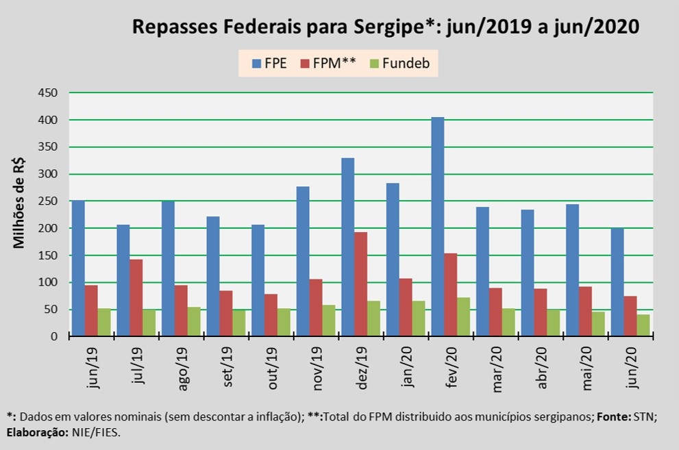 Análise realizada pelo Boletim Sergipe Econômico, parceria do Núcleo de Informações Econômicas da Federação das Indústrias do Estado de Sergipe (FIES) e do Departamento de Economia da UFS, com base nos dados da Secretaria do Tesouro Nacional (STN), indicou que o repasse do Fundo de Participação dos Estados (FPE) para Sergipe, em junho deste ano, chegou a quase R$ 199,7 milhões.