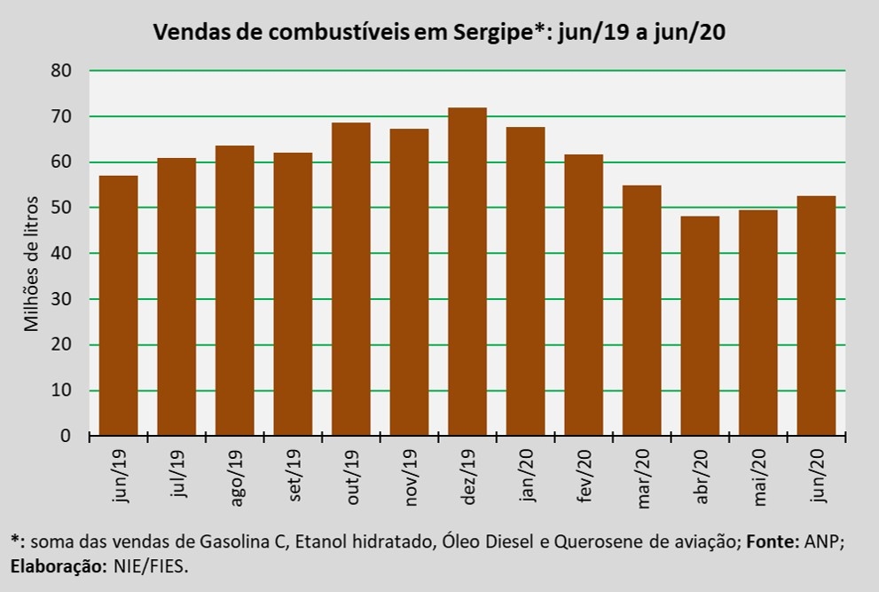 Análise realizada pelo Boletim Sergipe Econômico, parceria do Núcleo de Informações Econômicas da Federação das Indústrias do Estado de Sergipe (FIES) e do Departamento de Economia da UFS, com base nos dados da Agência Nacional do Petróleo, Gás Natural e Biocombustíveis (ANP), indicou que as vendas totais de combustíveis em Sergipe, em junho deste ano, somaram 52,6 milhões de litros, assinalando queda de 7,8% quando comparado a junho de 2019. Em relação ao mês imediatamente anterior, maio último, as vendas aumentaram 6,6%.