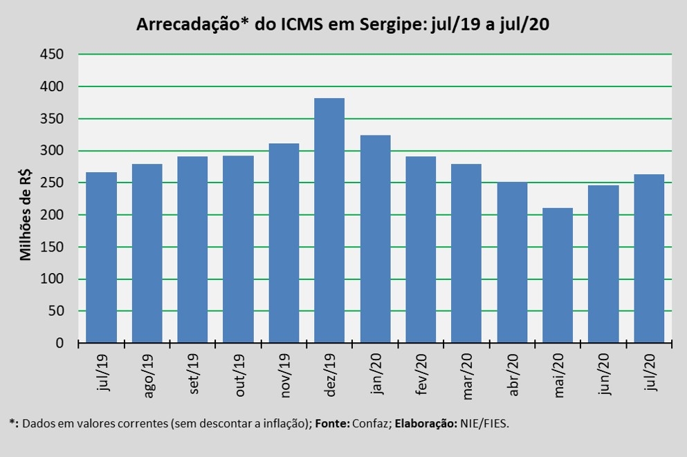 Análise realizada pelo Boletim Sergipe Econômico, parceria do Núcleo de Informações Econômicas da Federação das Indústrias do Estado de Sergipe (FIES) e do Departamento de Economia da UFS, com base nos dados do Conselho Nacional de Política Fazendária (Confaz), apontou que a arrecadação do Imposto sobre Circulação de Mercadorias e Prestação de Serviços (ICMS), em Sergipe, alcançou R$ 262,8 milhões, em julho deste ano.