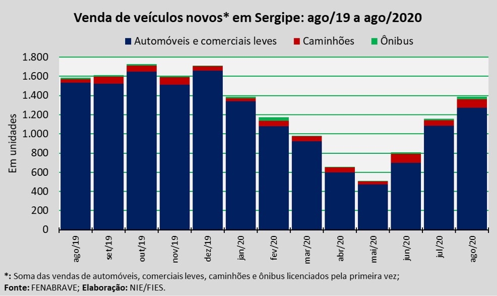 Análise realizada pelo Boletim Sergipe Econômico, parceria do Núcleo de Informações Econômicas da Federação das Indústrias do Estado de Sergipe (FIES) e do Departamento de Economia da UFS, com base nos dados da Federação Nacional da Distribuição de Veículos Automotores (FENABRAVE), apontou que as vendas de veículos novos no estado, em agosto último, totalizaram 1.390 unidades.