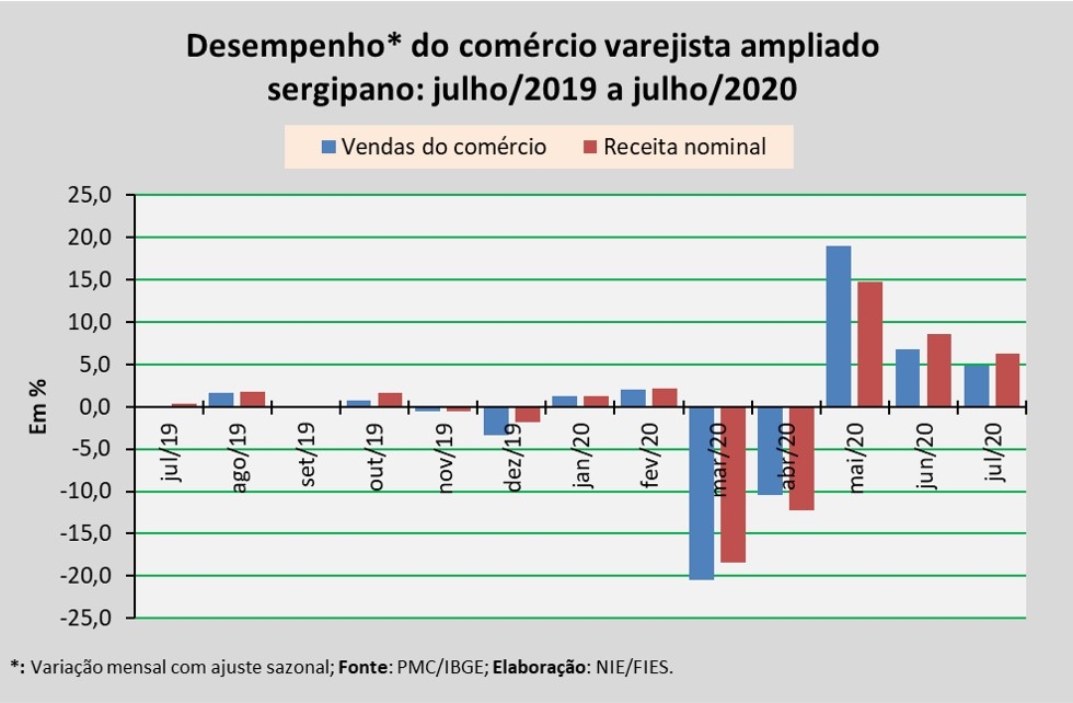 Análise realizada pelo Boletim Sergipe Econômico, parceria do Núcleo de Informações Econômicas da Federação das Indústrias do Estado de Sergipe (FIES) e do Departamento de Economia da UFS, com base nos dados da Pesquisa Mensal do Comércio (PMC) do IBGE, apontou que, em julho deste ano, as vendas do comércio varejista ampliado sergipano registraram aumento de 4,8% em relação ao mês imediatamente anterior (junho/2020), na série com ajuste sazonal (método que uniformiza os períodos de comparação). Já em relação a julho do ano passado, observou-se recuo de 4,0%.