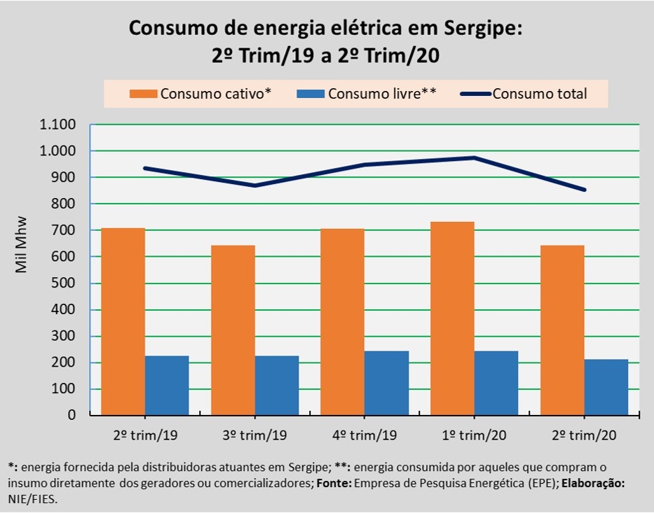 Análise realizada pelo Boletim Sergipe Econômico, parceria do Núcleo de Informações Econômicas da Federação das Indústrias do Estado de Sergipe (FIES) e do Departamento de Economia da UFS, com base nos dados da Empresa de Pesquisa Energética (EPE) que tem por finalidade prestar serviços ao Ministério de Minas e Energia (MME), constatou que o consumo de energia elétrica no estado totalizou aproximadamente 853,7 mil MWh (Megawatt-hora), no segundo trimestre de 2020.