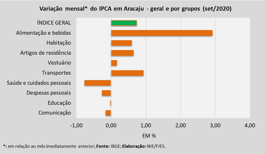 Dentre os nove grupos de produtos e serviços que foram pesquisados para medir o comportamento dos preços, em Aracaju, verificou-se aumento nos preços dos grupos de Alimentação e bebidas (+2,92%), Transportes (+0,93%), Artigos de residência (+0,64%), Habitação (+0,59%) e Vestuário (+0,16), no período analisado.