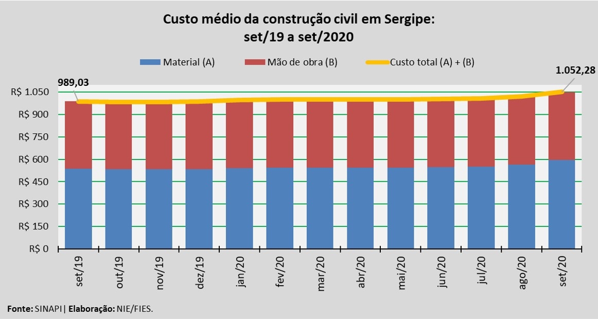 Análise realizada pelo Boletim Sergipe Econômico, parceria do Núcleo de Informações Econômicas da Federação das Indústrias do Estado de Sergipe (FIES) e do Departamento de Economia da UFS, com base nos dados do Sistema Nacional de Pesquisa de Custos e Índices da Construção Civil – SINAPI, do IBGE e da Caixa Econômica Federal, revelou que o custo médio da construção em Sergipe, por metro quadrado (m²), em setembro deste ano, apresentou acréscimo de 2,9%, quando comparado com o mês imediatamente anterior, agosto último. Em relação ao mês de setembro do ano passado, o custo assinalou aumento de 6,4%.