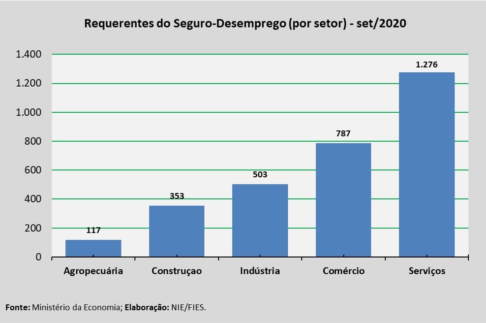 A análise dos dados apontou que 42% das solicitações foram provenientes de trabalhadores desligados do setor de serviços (1.276 requerentes), seguido do Comércio, com 25,9% (787 requerentes), e Indústria, com 16,6% (503 requerentes). Logo após figuraram os setores da Construção, com 11,6% do total de solicitações (353 requerentes), e da Agropecuária, com 3,9% (117 requerentes).