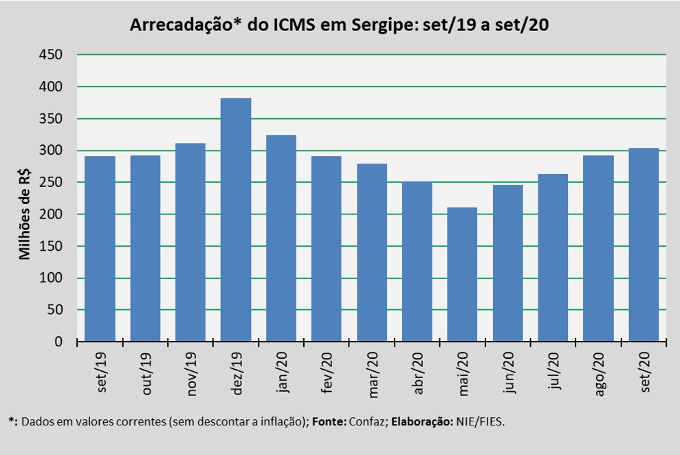 Análise realizada pelo Boletim Sergipe Econômico, parceria do Núcleo de Informações Econômicas da Federação das Indústrias do Estado de Sergipe (FIES) e do Departamento de Economia da UFS, com base nos dados do Conselho Nacional de Política Fazendária (Confaz), apontou que a arrecadação do Imposto sobre Circulação de Mercadorias e Prestação de Serviços (ICMS), em Sergipe, somou R$ 303,9 milhões, em setembro deste ano.