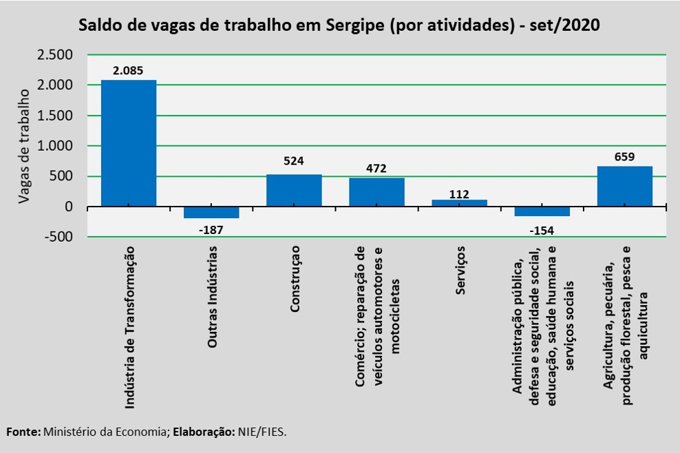 Análise realizada pelo Boletim Sergipe Econômico, parceria do Núcleo de Informações Econômicas da Federação das Indústrias do Estado de Sergipe (FIES) e do Departamento de Economia da UFS, com base nos dados do Novo Cadastro Geral de empregados e desempregados (Caged) da Secretaria de Trabalho do Ministério da Economia, revelou que houve saldo positivo de 3.511 vagas de emprego com carteira assinada no estado, em setembro deste ano. O saldo decorre da diferença entre 8.659 admissões e 5.148 desligamentos no período analisado.