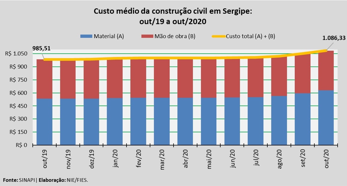 Análise realizada pelo Boletim Sergipe Econômico, parceria do Núcleo de Informações Econômicas da Federação das Indústrias do Estado de Sergipe (FIES) e do Departamento de Economia da UFS, com base nos dados do Sistema Nacional de Pesquisa de Custos e Índices da Construção Civil – SINAPI, do IBGE e da Caixa Econômica Federal, revelou que o custo médio da construção em Sergipe, por metro quadrado (m²), em outubro deste ano, apresentou acréscimo de 3,2%, quando comparado com o mês imediatamente anterior, setembro último. Em relação ao mês de outubro do ano passado, o custo assinalou aumento de 10,2%.