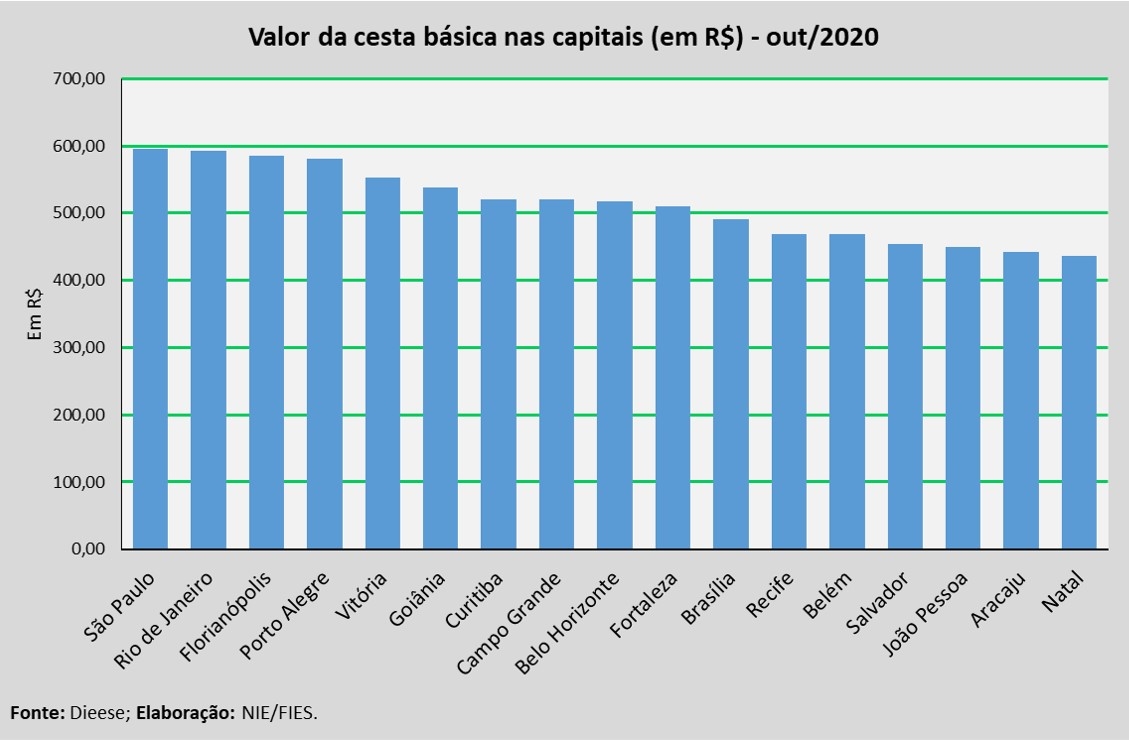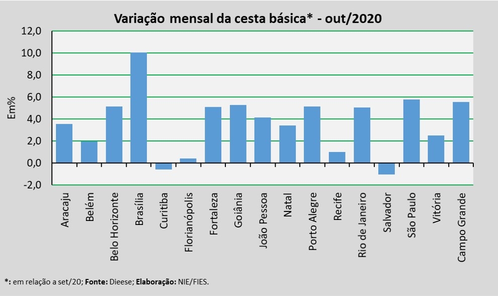 Em termos relativos, quando comparado com o mês imediatamente anterior, setembro deste ano, verificou-se aumento no valor da cesta em 15 das 17 capitais pesquisadas. Os maiores aumentos foram registrados em Brasília (+10,0%), São Paulo (+5,8%) e Campo Grande (+5,5%). Apenas Salvador (-1,1%) e Curitiba (-0,6%) apresentaram redução no valor da cesta.