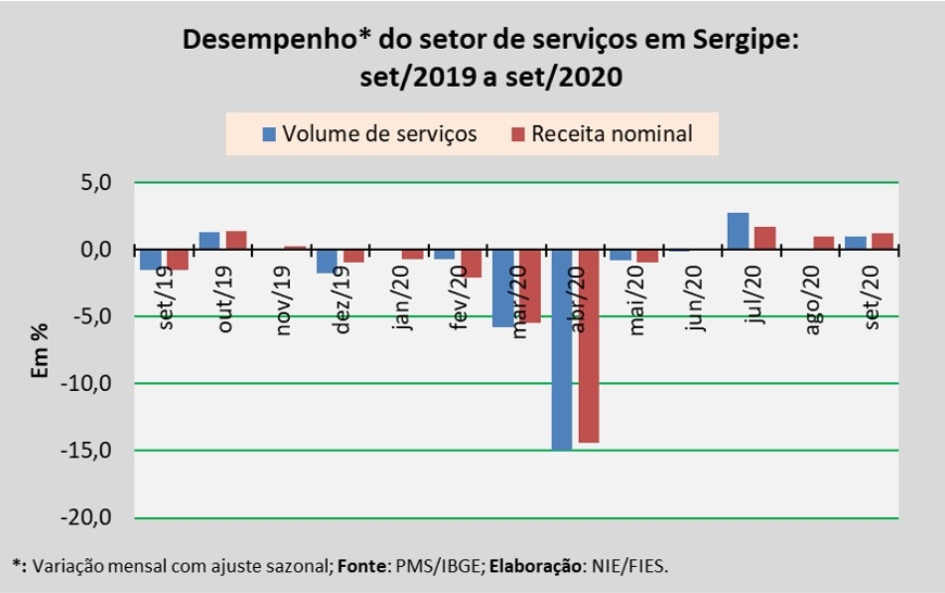 Análise realizada pelo Boletim Sergipe Econômico, parceria do Núcleo de Informações Econômicas da Federação das Indústrias do Estado de Sergipe (FIES) e do Departamento de Economia da UFS, com base nos dados da Pesquisa Mensal de Serviços (PMS) do IBGE, revelou que, em setembro deste ano, o setor de serviços em Sergipe assinalou crescimento de 1,0% no volume de serviços prestados, em relação ao último mês de agosto, na série com ajuste sazonal (método utilizado para uniformizar os períodos de comparação). Na comparação com setembro do ano passado, o volume de serviços registrou retração de 18,4%.