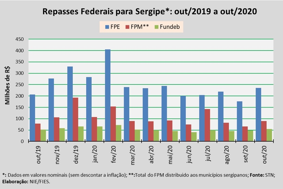 Análise realizada pelo Boletim Sergipe Econômico, parceria do Núcleo de Informações Econômicas da Federação das Indústrias do Estado de Sergipe (FIES) e do Departamento de Economia da UFS, com base nos dados da Secretaria do Tesouro Nacional (STN), indicou que, em outubro deste ano, o repasse do Fundo de Participação dos Estados (FPE) para Sergipe somou quase R$ 235,6 milhões.
