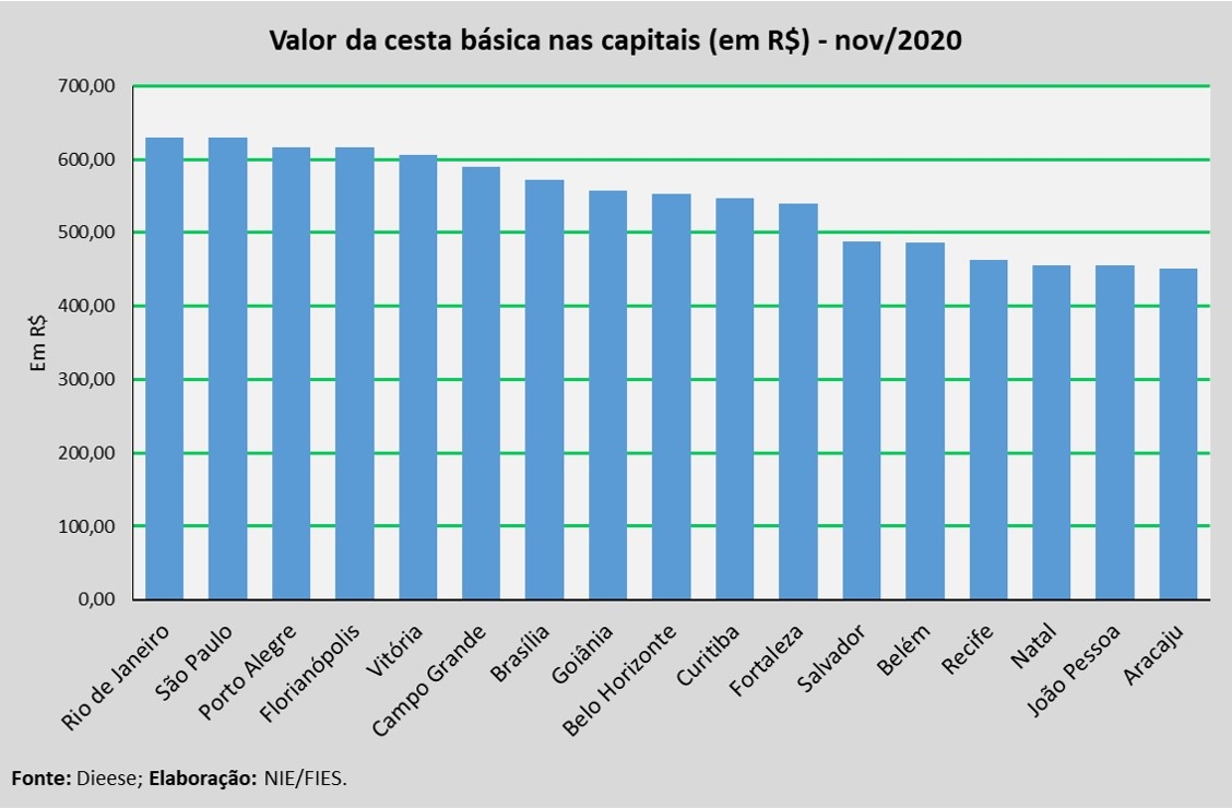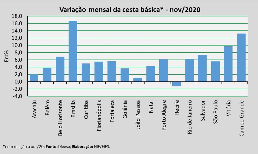 Em termos relativos, quando comparado com o mês imediatamente anterior, outubro deste ano, verificou-se aumento no valor da cesta em quase todas as capitais pesquisadas. A exceção foi Recife, que apresentou redução de 1,3% no valor da cesta. Os maiores aumentos foram registrados em Brasília (+16,8%), Campo Grande (+13,3%) e Vitória (+9,7%).