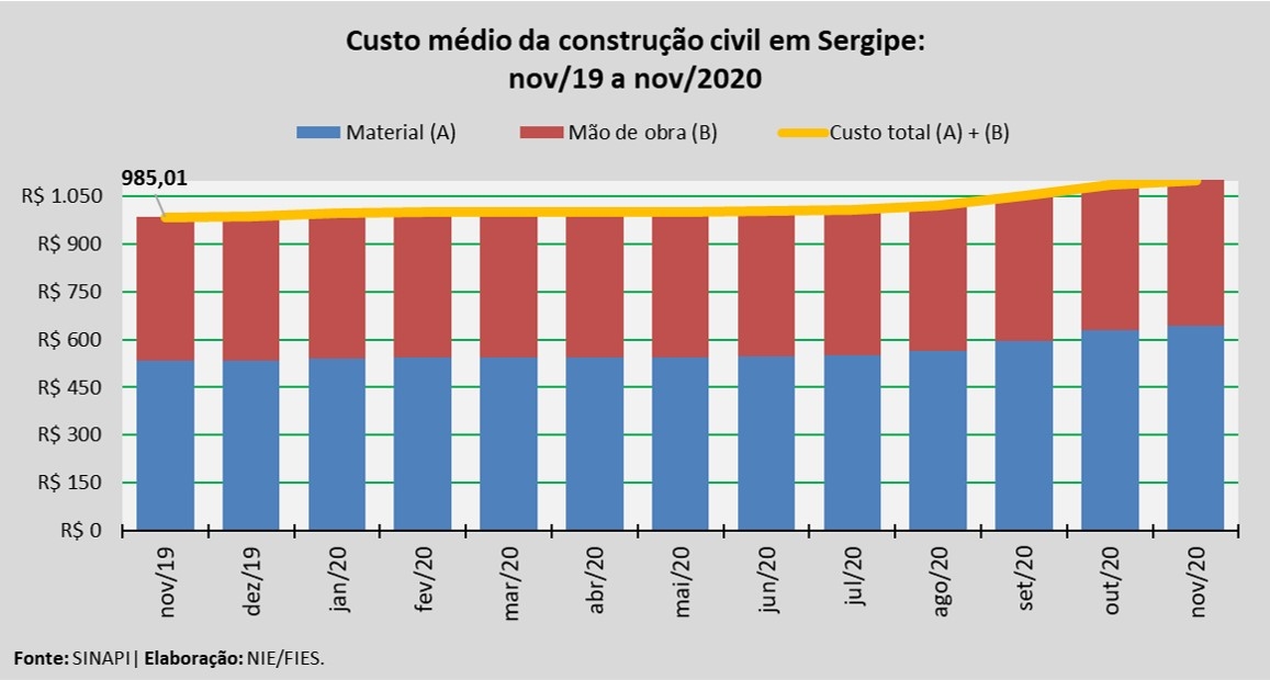 Análise realizada pelo Boletim Sergipe Econômico, parceria do Núcleo de Informações Econômicas da Federação das Indústrias do Estado de Sergipe (FIES) e do Departamento de Economia da UFS, com base nos dados do Sistema Nacional de Pesquisa de Custos e Índices da Construção Civil – SINAPI, do IBGE e da Caixa Econômica Federal, revelou que o custo médio da construção em Sergipe, por metro quadrado (m²), em novembro deste ano, apresentou acréscimo de 1,4%, quando comparado com o mês imediatamente anterior, outubro último. Em relação ao mês de novembro do ano passado, o custo assinalou aumento de 11,8%.