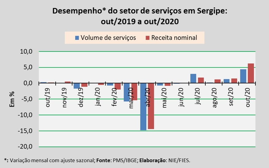 Análise realizada pelo Boletim Sergipe Econômico, parceria do Núcleo de Informações Econômicas da Federação das Indústrias do Estado de Sergipe (FIES) e do Departamento de Economia da UFS, com base nos dados da Pesquisa Mensal de Serviços (PMS) do IBGE, revelou que, em outubro deste ano, o setor de serviços em Sergipe assinalou crescimento de 4,4% no volume de serviços prestados, em relação ao último mês de setembro, na série com ajuste sazonal (método utilizado para uniformizar os períodos de comparação). Na comparação com outubro do ano passado, o volume de serviços registrou retração de 15%.