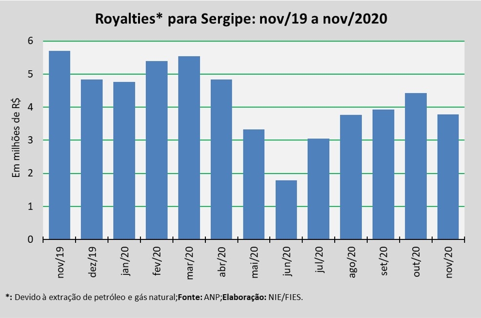 Análise realizada pelo Boletim Sergipe Econômico, parceria do Núcleo de Informações Econômicas da Federação das Indústrias do Estado de Sergipe (FIES) e do Departamento de Economia da UFS, com base nos dados da Agência Nacional do Petróleo, Gás Natural e Biocombustíveis (ANP), revelou que o pagamento de royalties ao Estado de Sergipe, referentes à extração de petróleo e gás natural do mês de setembro deste ano, somou R$ 3,7 milhões. O valor, segundo a ANP, foi creditado em novembro.