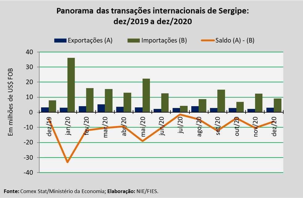 Com esses dados, o saldo da balança comercial sergipana - diferença entre o montante de exportações e importações -, no período analisado, resultou em saldo negativo de US$ 6,1 milhões. No acumulado do ano de 2020, o saldo da balança comercial em Sergipe registrou déficit de aproximadamente US$ 132,6 milhões.