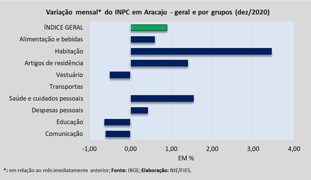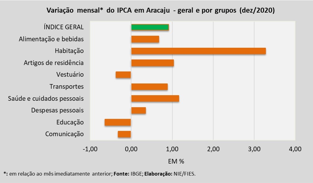 Análise realizada pelo Boletim Sergipe Econômico, parceria do Núcleo de Informações Econômicas da Federação das Indústrias do Estado de Sergipe (FIES) e do Departamento de Economia da UFS, com base nos dados do Instituto Brasileiro de Geografia e Estatística (IBGE), revelou que, em dezembro de 2020, a capital sergipana teve inflação de 0,91%, medida pelo Índice de Preços ao Consumidor Amplo – IPCA.