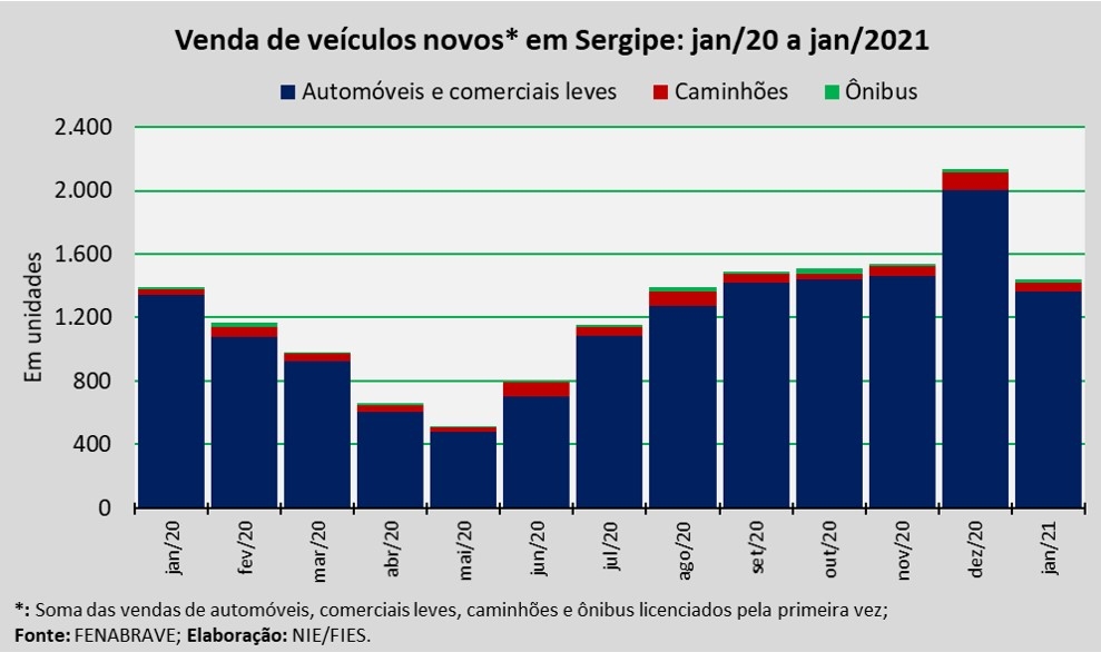 Análise realizada pelo Boletim Sergipe Econômico, parceria do Núcleo de Informações Econômicas (NIE) da Federação das Indústrias do Estado de Sergipe (FIES) e do Departamento de Economia da UFS, com base nos dados da Federação Nacional da Distribuição de Veículos Automotores (FENABRAVE), apontou que as vendas de veículos novos no estado, no primeiro mês do ano, totalizaram 1.443 unidades.