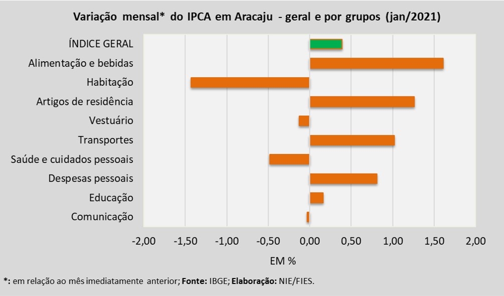 Análise realizada pelo Boletim Sergipe Econômico, parceria do Núcleo de Informações Econômicas da Federação das Indústrias do Estado de Sergipe (FIES) e do Departamento de Economia da UFS, com base nos dados do Instituto Brasileiro de Geografia e Estatística (IBGE), revelou que, em janeiro deste ano, a capital sergipana teve inflação de 0,39%, medida pelo Índice de Preços ao Consumidor Amplo – IPCA.