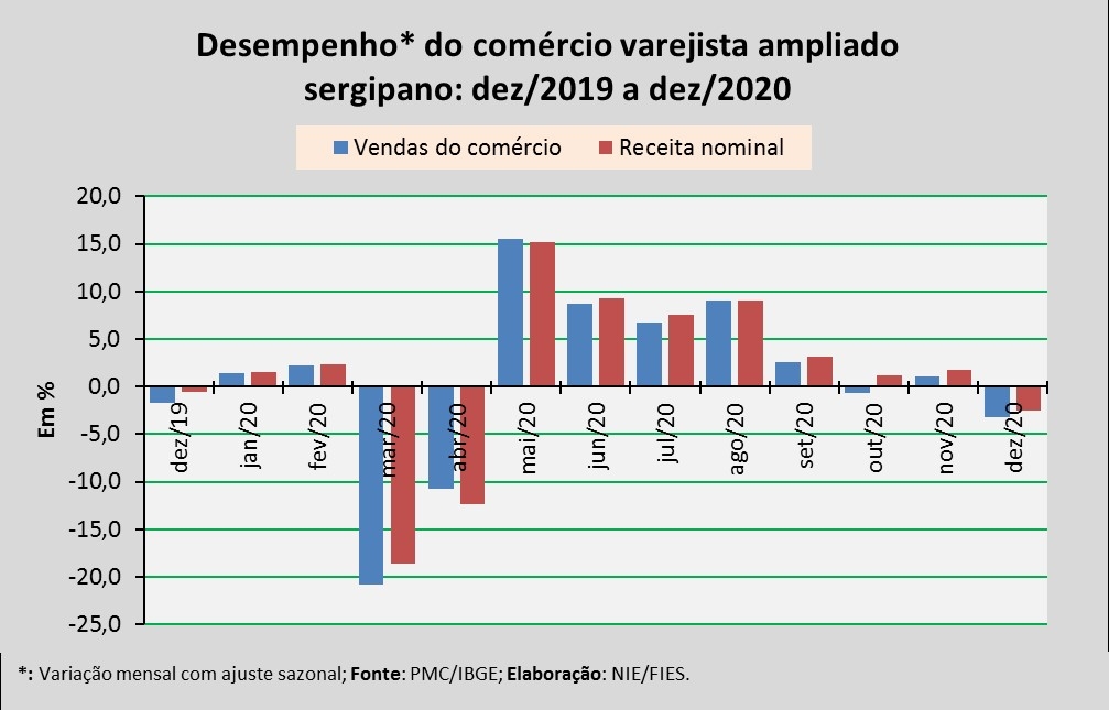 Análise realizada pelo Boletim Sergipe Econômico, parceria do Núcleo de Informações Econômicas da Federação das Indústrias do Estado de Sergipe (FIES) e do Departamento de Economia da UFS, com base nos dados da Pesquisa Mensal do Comércio (PMC) do IBGE, apontou que, em dezembro de 2020, as vendas do comércio varejista ampliado sergipano registraram recuo de 3,2% em relação ao mês imediatamente anterior (novembro/2020), na série com ajuste sazonal (método que uniformiza os períodos de comparação). Já em relação a dezembro de 2019, observou-se aumento de 8,1%.
