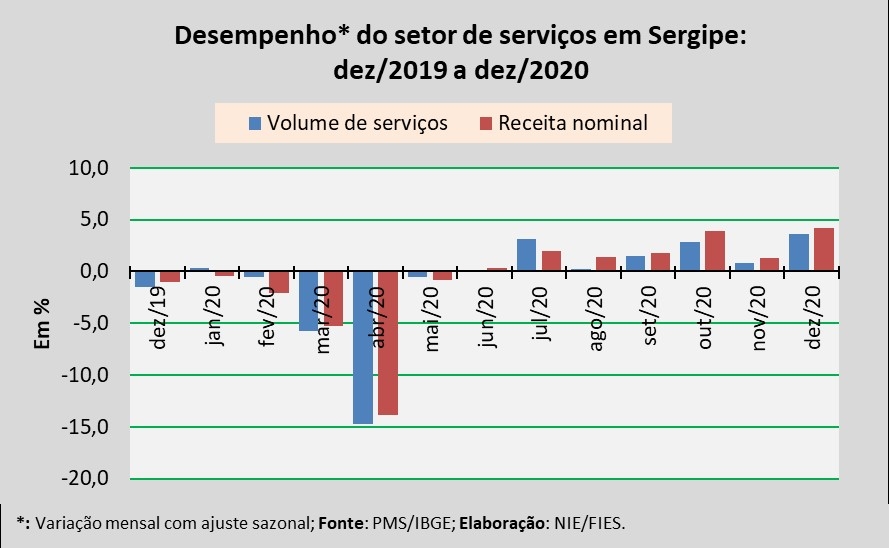 Análise realizada pelo Boletim Sergipe Econômico, parceria do Núcleo de Informações Econômicas da Federação das Indústrias do Estado de Sergipe (FIES) e do Departamento de Economia da UFS, com base nos dados da Pesquisa Mensal de Serviços (PMS) do IBGE, revelou que, em dezembro de 2020, o setor de serviços em Sergipe assinalou crescimento de 3,6% no volume de serviços prestados, em relação ao último mês de novembro, na série com ajuste sazonal (método utilizado para uniformizar os períodos de comparação). Na comparação com dezembro de 2019, o volume de serviços registrou retração de 10,3%.