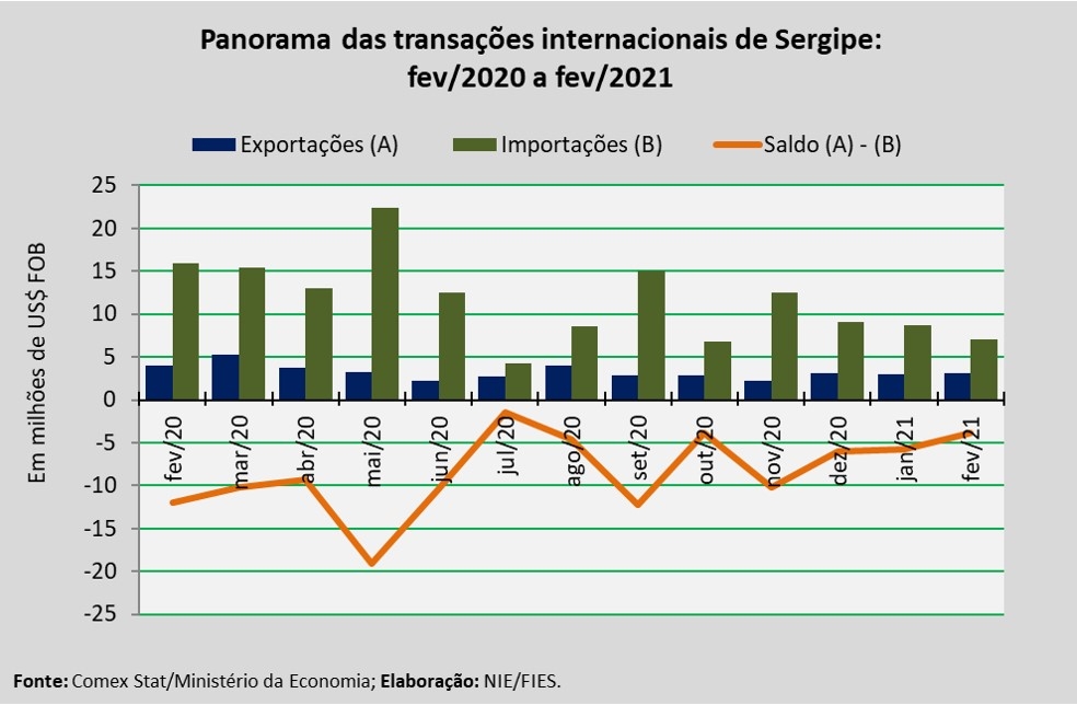 Análise realizada pelo Centro Internacional de Negócios – CIN/SE, da Federação das Indústrias do Estado de Sergipe (FIES), com apoio do Núcleo de Informações Econômicas (NIE), com base os dados do Comex Stat, sistema para consultas e extração de dados do comércio exterior brasileiro, disponibilizado pelo Ministério da Economia, apontou que as exportações sergipanas, em fevereiro deste ano, somaram US$ 3,1 milhões. O montante registrado representa aumento de 3,4%, quando comparado com o mês imediatamente anterior, janeiro último. Já em relação a fevereiro de 2020, o total de exportações apresentou recuo de 22,1%.