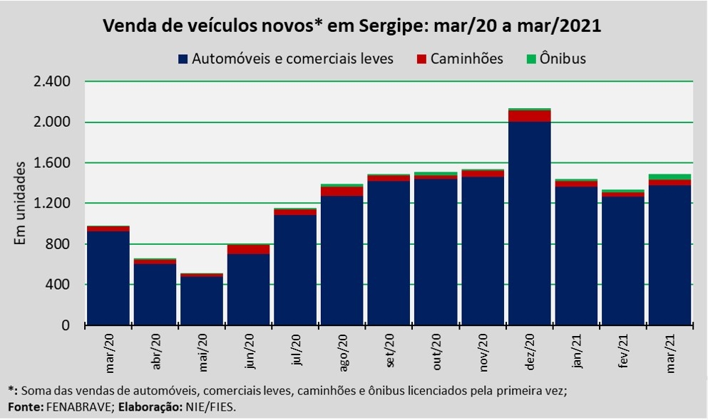 Análise realizada pelo Boletim Sergipe Econômico, parceria do Núcleo de Informações Econômicas (NIE) da Federação das Indústrias do Estado de Sergipe (FIES) e do Departamento de Economia da UFS, com base nos dados da Federação Nacional da Distribuição de Veículos Automotores (FENABRAVE), apontou que as vendas de veículos novos no estado, no terceiro mês do ano, totalizaram 1.491 unidades.