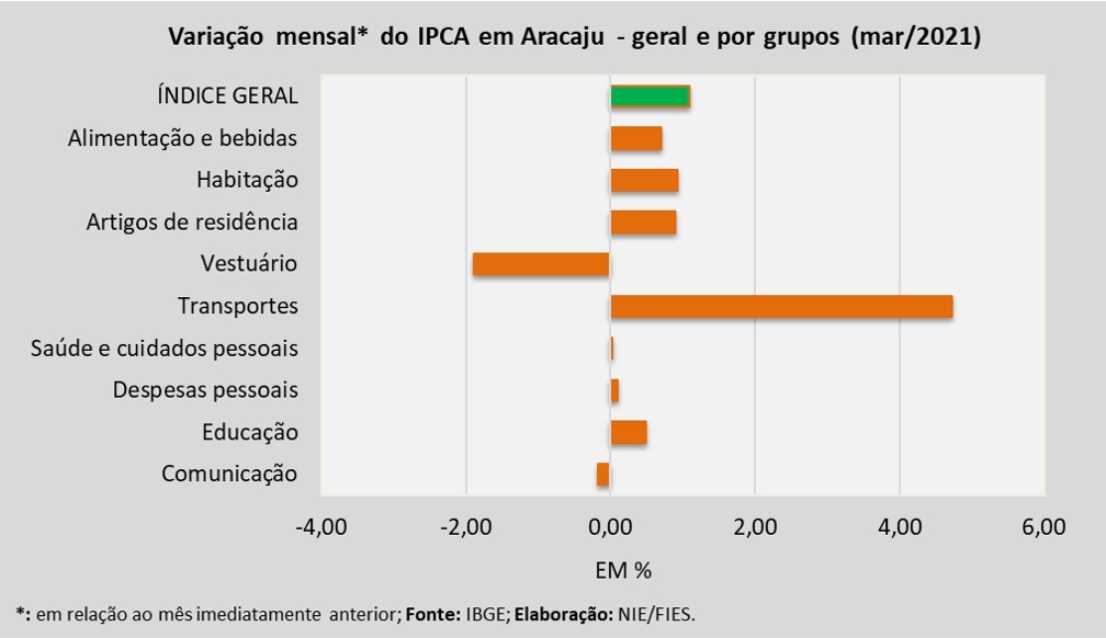 Análise realizada pelo Boletim Sergipe Econômico, parceria do Núcleo de Informações Econômicas da Federação das Indústrias do Estado de Sergipe (FIES) e do Departamento de Economia da UFS, com base nos dados do Instituto Brasileiro de Geografia e Estatística (IBGE), revelou que, em março deste ano, a capital sergipana teve inflação de 1,09%, medida pelo Índice de Preços ao Consumidor Amplo – IPCA.